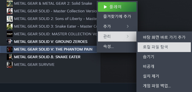 스팀 라이브러리 좌측 목록에서 팬텀페인에 대고 우클릭 > 관리 > 로컬 파일 보기를 하면