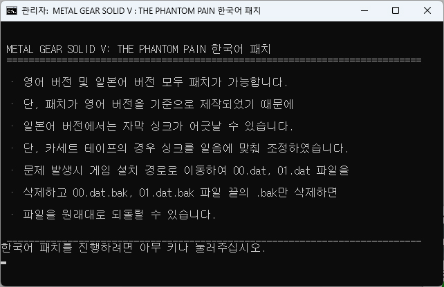 | 팬텀페인 일본어 음성 한국어 패치 방법II (1) | 2025.02.10 |
